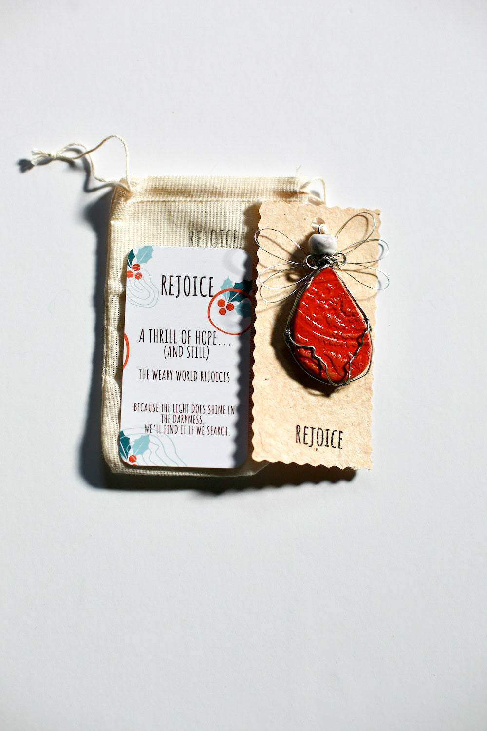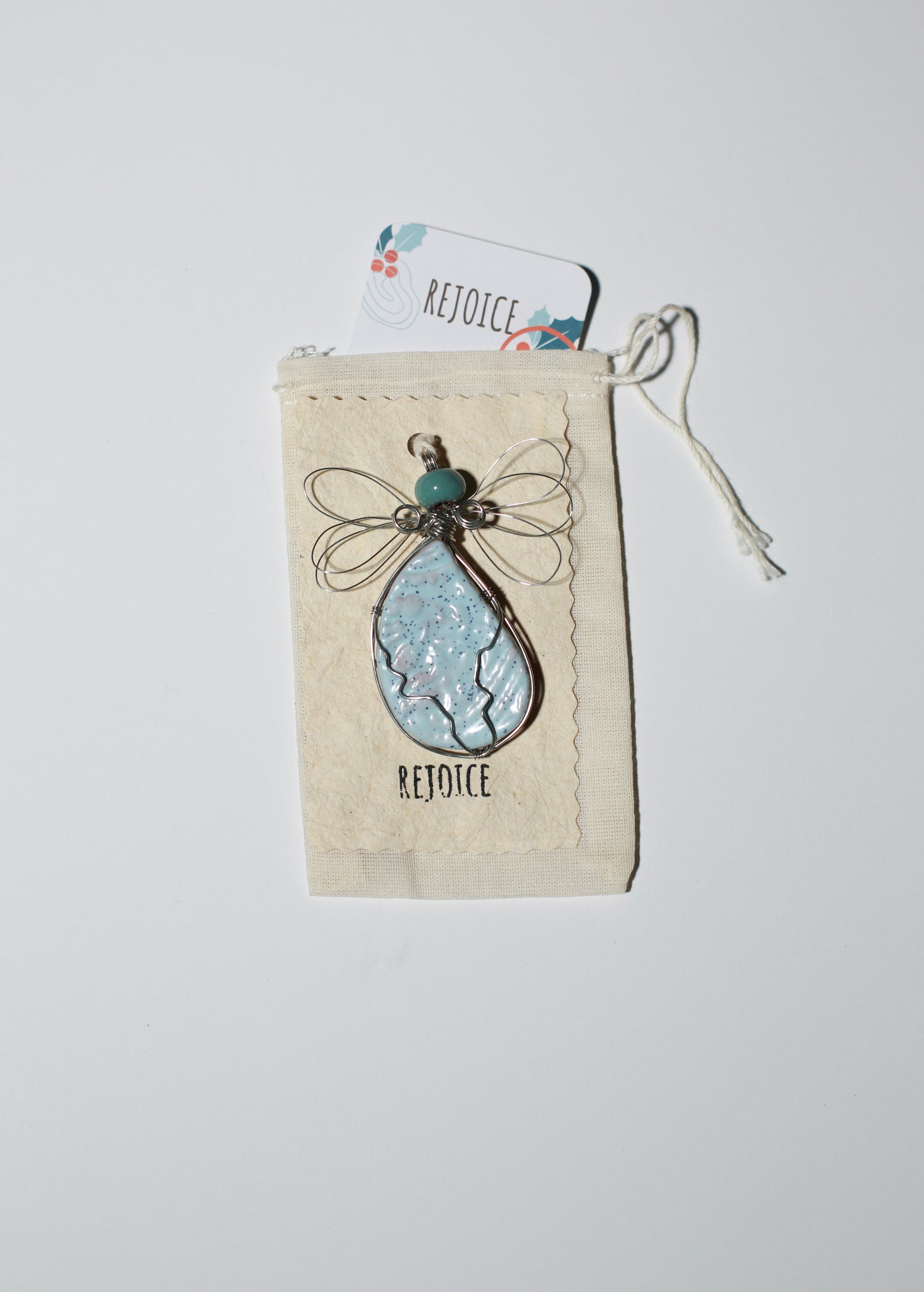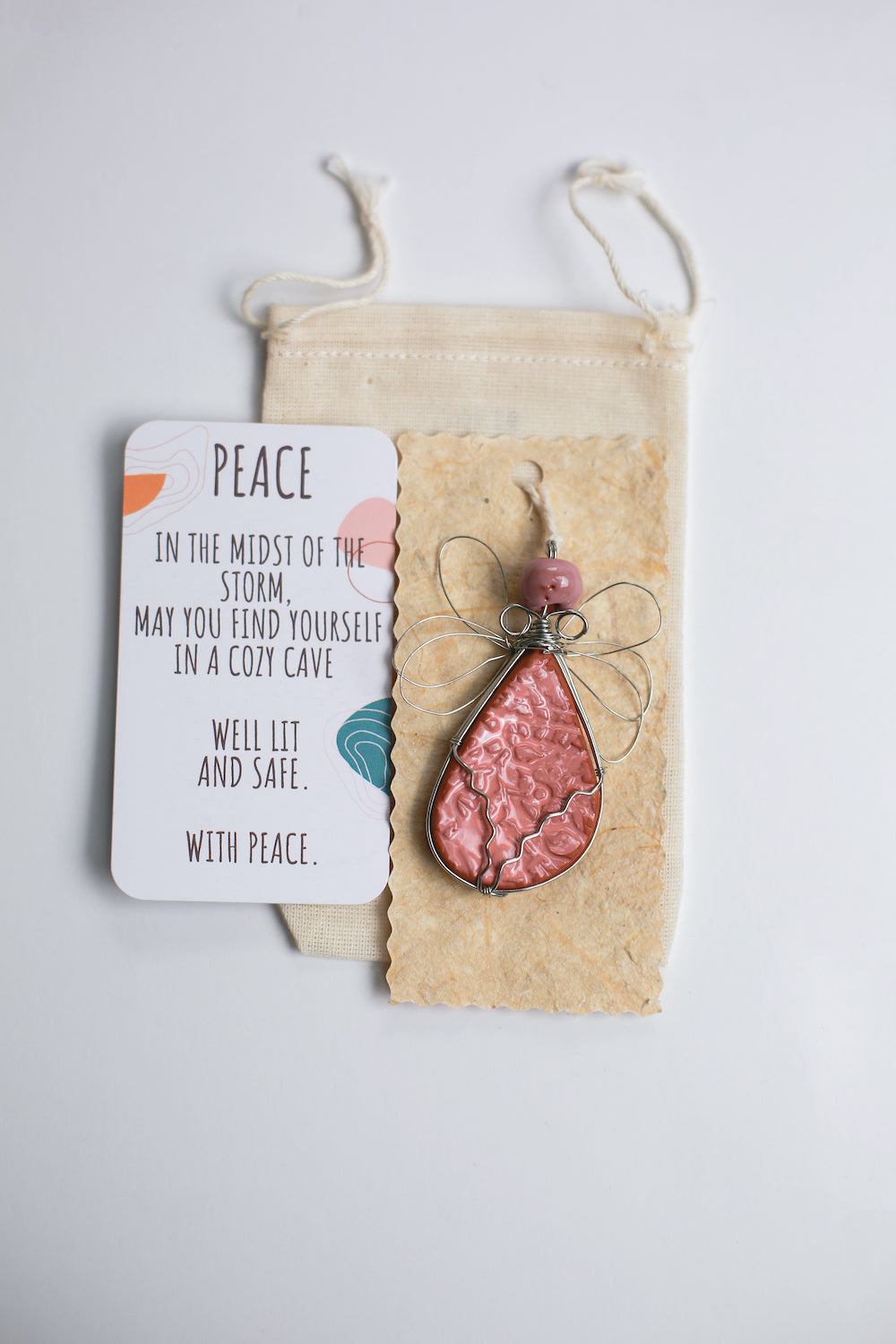 Each Angel comes in its own Drawstring Bag with the sentiment stamped on front, Inside you'll get a printed giving card, explaining the significance of the Angels and the Sentiment you choose. Angel is perched on the stamped handmade paper, which you can write on or leave blank. It's a lovely presentation...like giving a big safe hug to someone you love!
